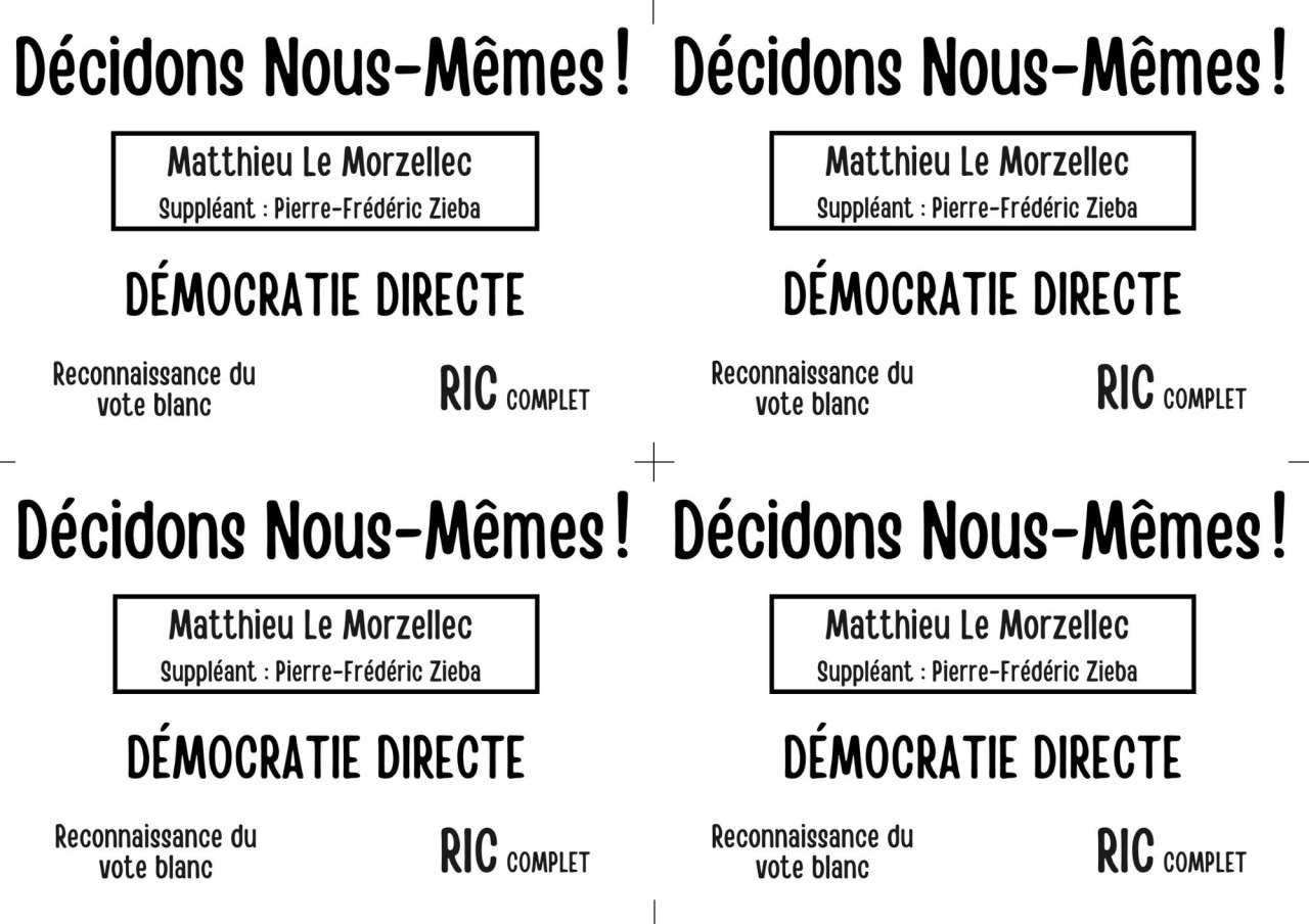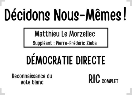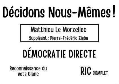 La coalition démocratique Décidons Nous-Mêmes a déposé une candidature pour relayer la volonté populaire, à l'élection législative partielle de l'Isère, avec Matthieu Le Morzellec (candidat de Brest La Liste Citoyenne en 2020) et son suppléant Pierre-Frédéric Zieba, Gilets Jaunes à Brest, Marseille et Paris.